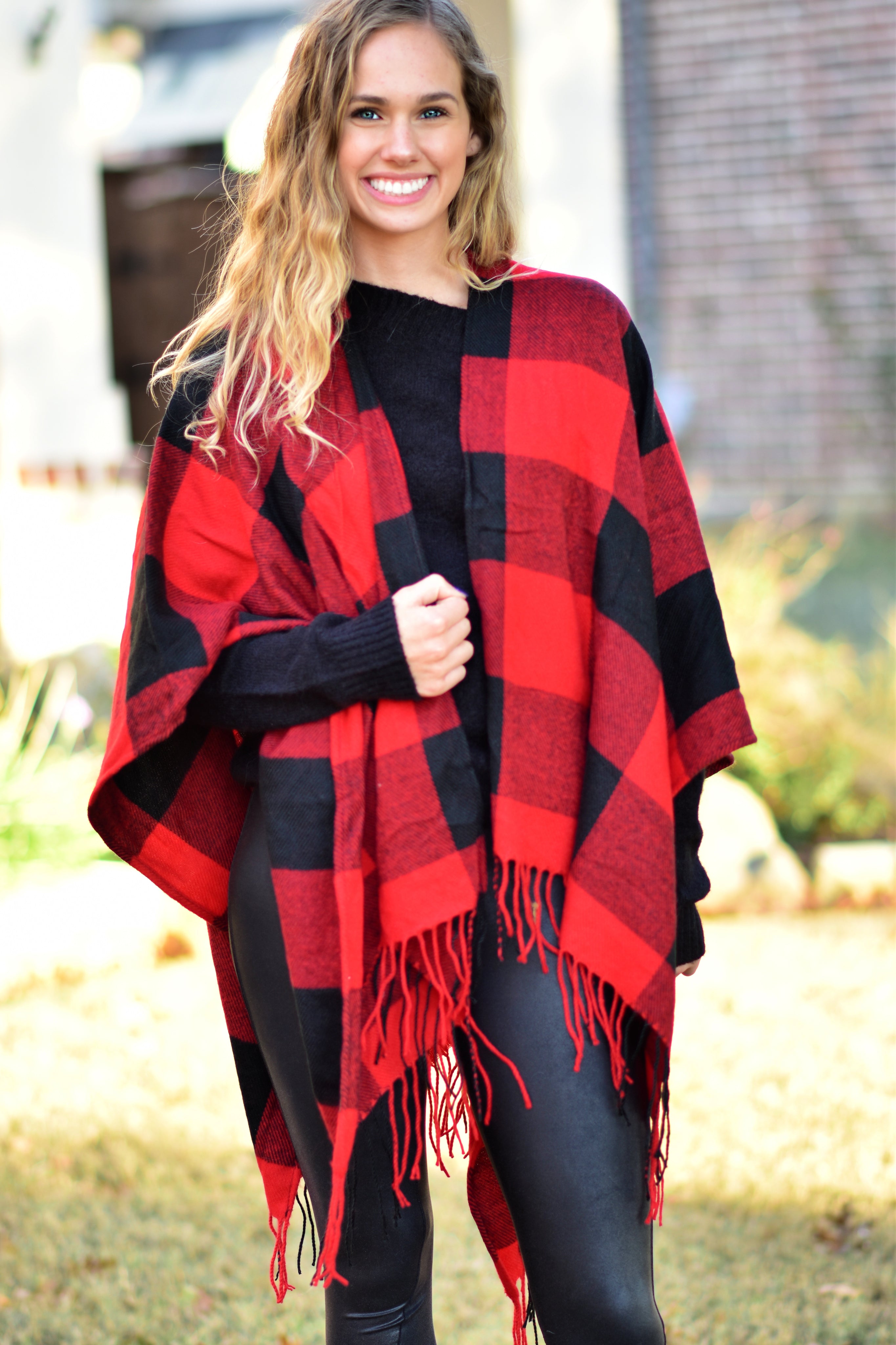 A lightweight and cozy instant outfit maker! Just throw this super soft buffalo check poncho on over your favorite leggings and sweater or long sleeved tee.