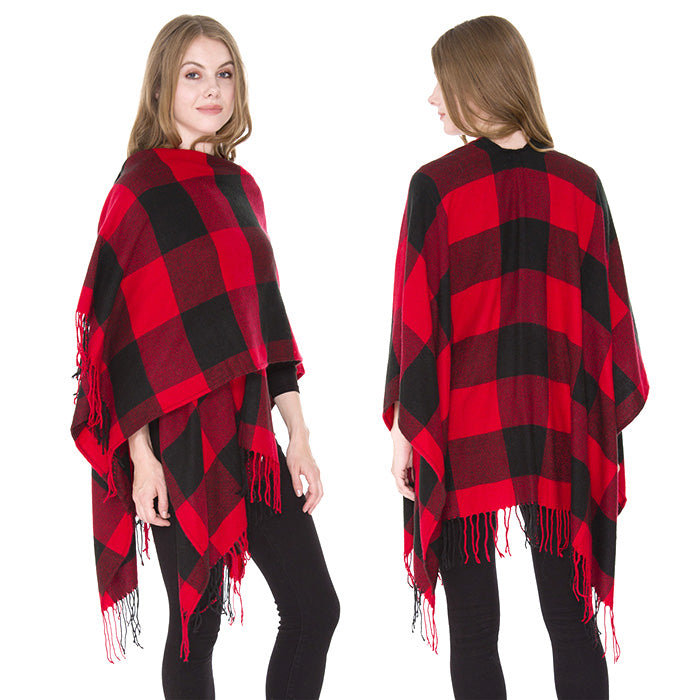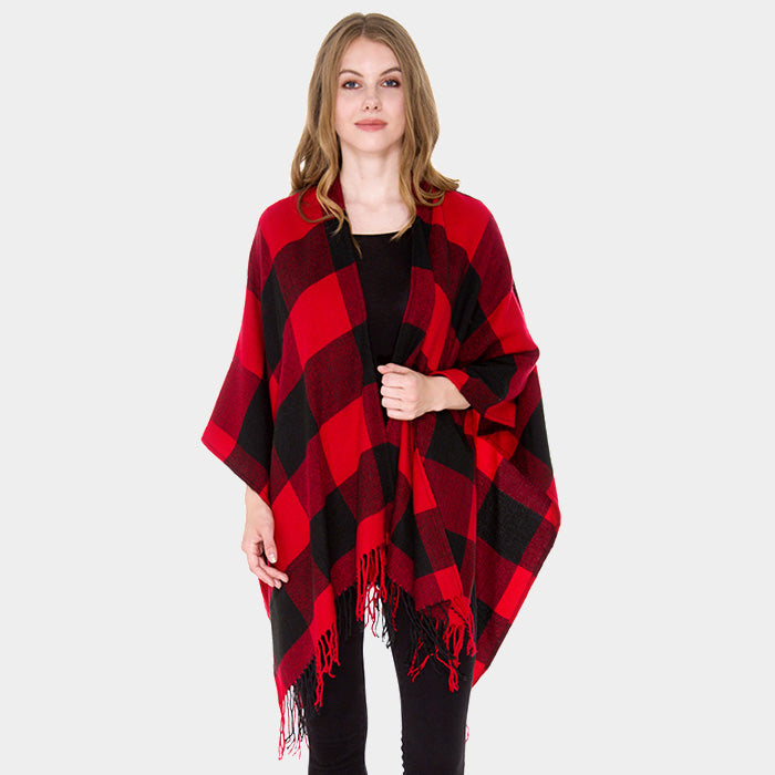 Buffalo Check Tassel Fringe Ruana Poncho - Red