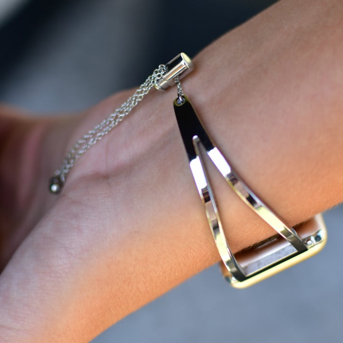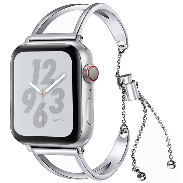 Add instant style to your Apple Watch with this high-quality stainless steel bracelet band. Unique toggle closure with chain adjusts to fit all wrists.