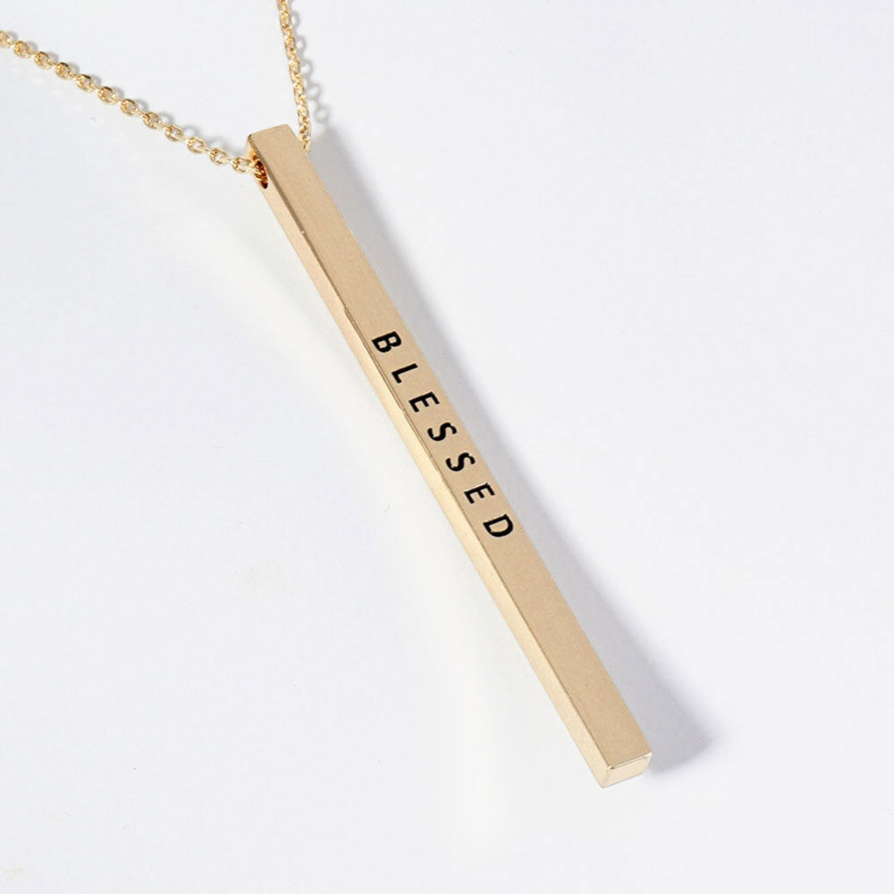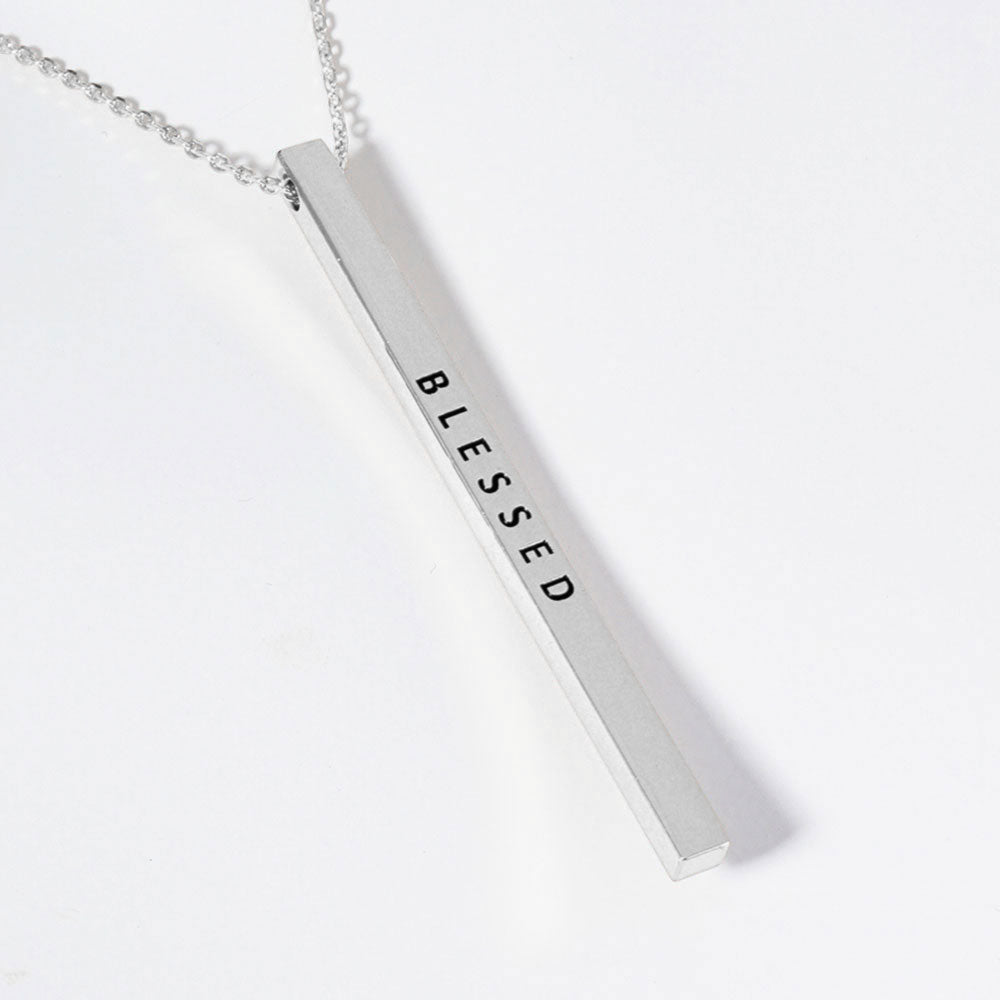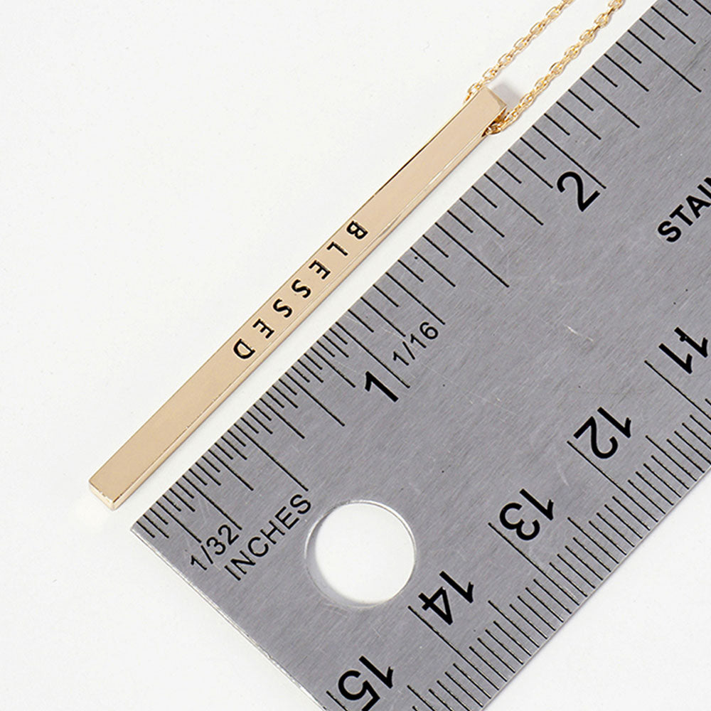 Show gratitude with this elegant vertical bar necklace, delicately engraved with the word "BLESSED". A timeless piece that blends meaning with modern style, it's perfect for everyday wear or heartfelt gifting. Whether layered or worn solo, its sleek design adds a touch of quiet sophistication to any look.