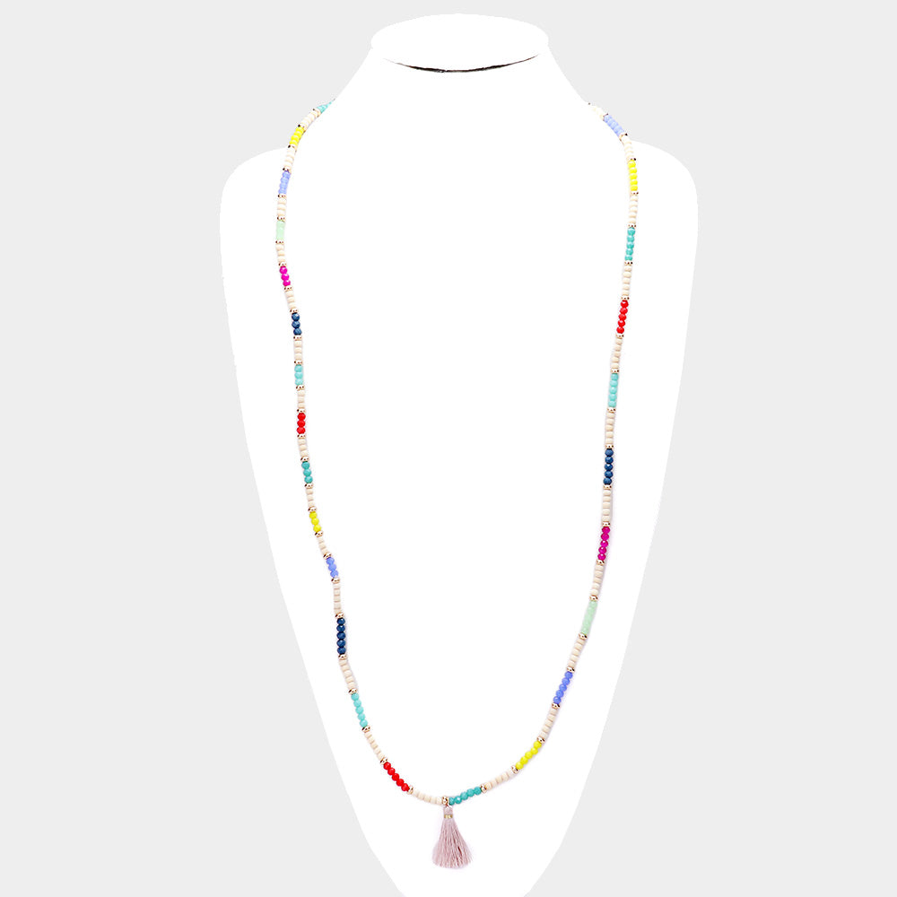 Add a vibrant touch to your accessories collection with our multi-color tassel stretch dual bracelet and necklace. This eye-catching piece is a combination of colorful beads that bring a playful and trendy vibe to your style.