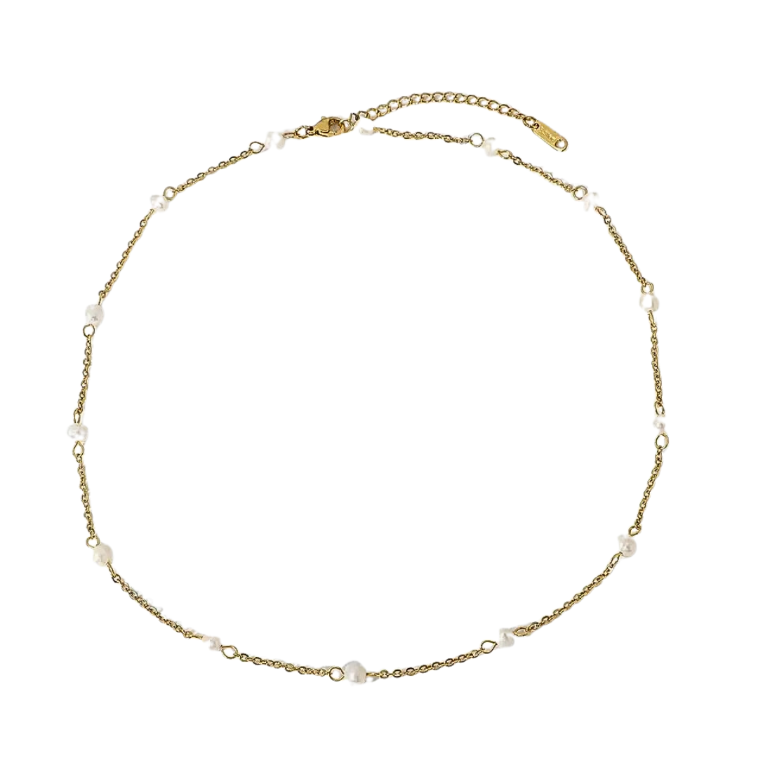Adorn yourself with this beautiful 18k gold-plated pearl chain necklace. Its delicate design and stunning pearls make it a timeless and elegant piece perfect for any occasion. Add a touch of sophistication and charm to your look!