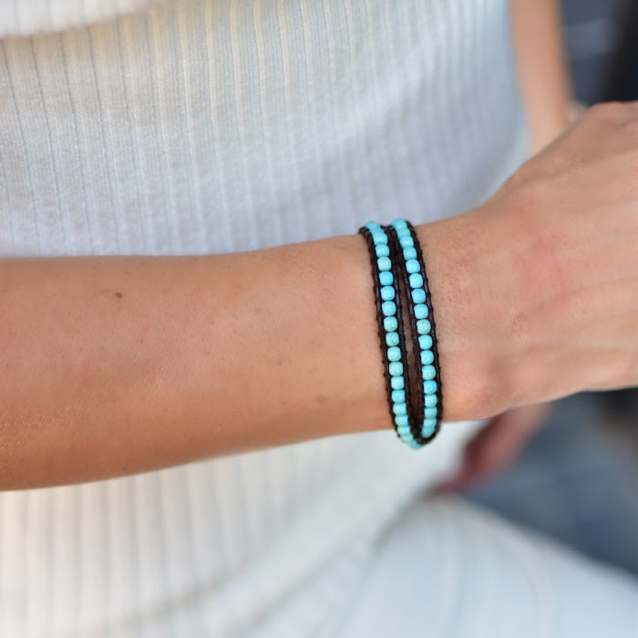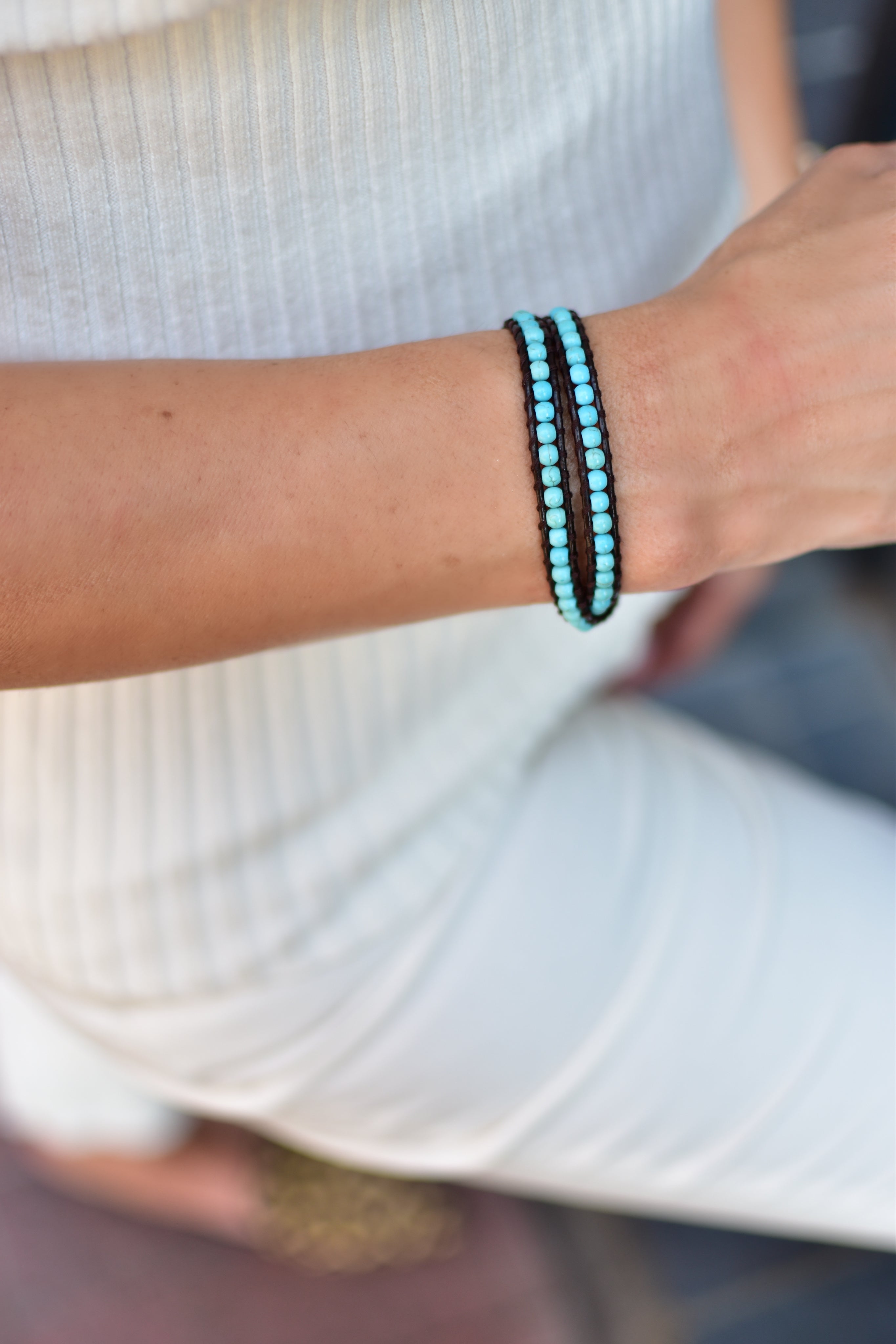 This double wrap signature bracelet features turquoise beads on dark brown leather. Layer it up for more impact!