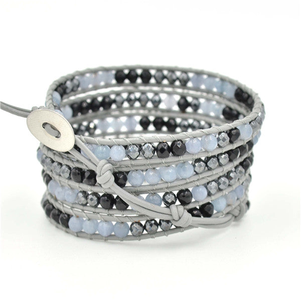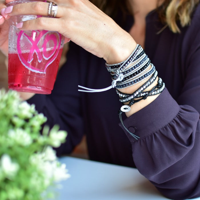 This Black and Gray Beads on Gray Leather Wrap Bracelet is a surefire way to add versatility to your wardrobe. Expertly crafted, the black, silver and clear hematite beads on a gray leather wrap make a bold statement that won't go unnoticed! So go on, wrap yourself in chic!