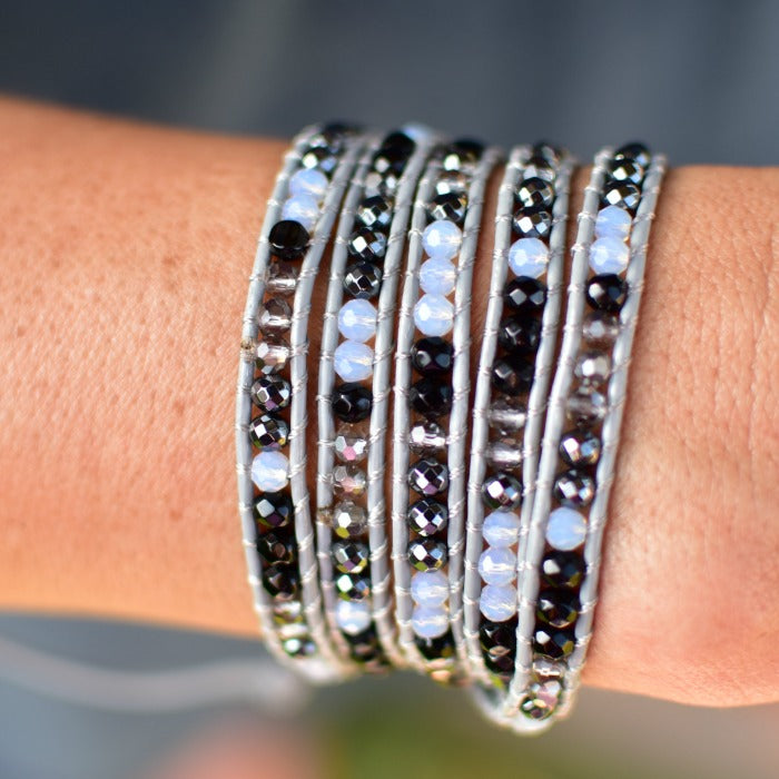 Black and Gray Beads on Gray Leather Wrap Bracelet
